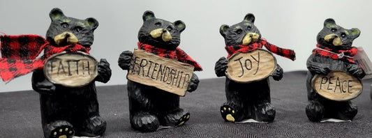 Adorable (Set of four) 3.5" BLACK BEARS, with signs: FAITH, FRIENDSHIP, JOY and PEACE- NEW