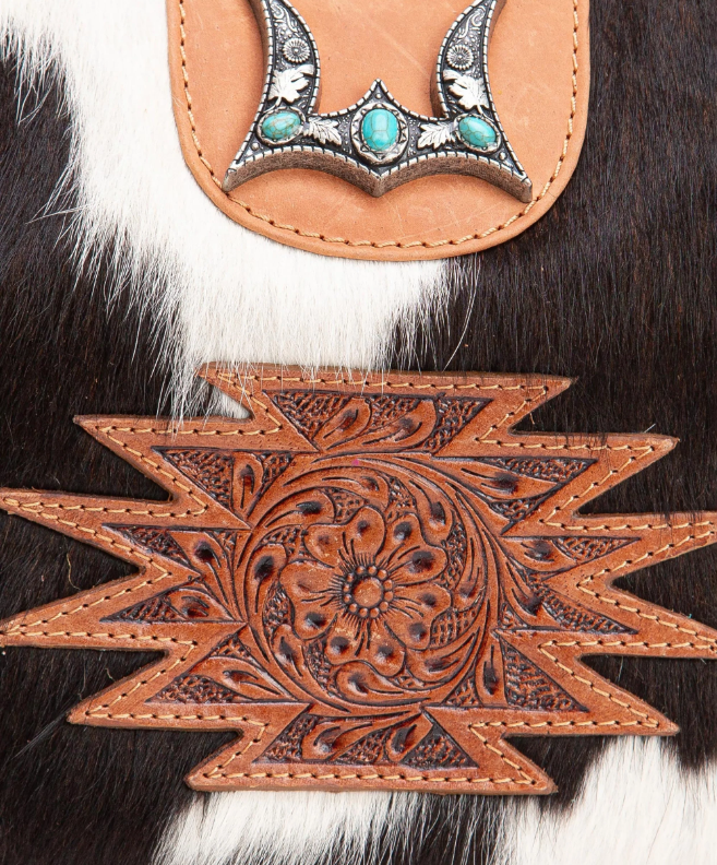 The Desert Desire Large Bag combines rugged beauty with refined elegance. Crafted from hair-on cowhide and soft calfskin, this shoulder bag features a small but striking handtooled patch that adds a unique, artisanal touch. The rich texture of the cowhide, paired with the smooth calfskin, creates a perfect balance of durability and luxury.