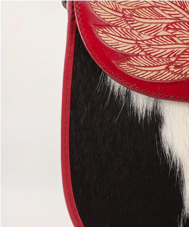 The Aurelia Mini Bag in sleek handtooled leather and hair-on cowhide for a bold, textured look. Featuring intricate handtooling on the flap, this crossbody bag blends artisanal craftsmanship with luxurious materials. The rich cowhide adds character, while the calfskin ensures both durability and sophistication.