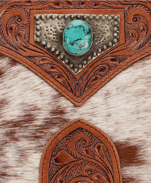 This striking brown and white cowhide bag captures the essence of Western craftsmanship with its signature concho centerpiece and intricate tooling details. The textured hair-on leather and fringed accents deliver authentic character while maintaining refined quality. Designed for versatility, it transitions seamlessly between shoulder and crossbody wear, adapting to your lifestyle with ease. Premium construction ensures lasting durability without compromising on the luxurious tactile experience. Whether styled with casual pieces or more polished ensembles, the Mojave Tassel Bag serves as a distinctive accessory that grounds any look with bohemian sophistication and desert-inspired flair.