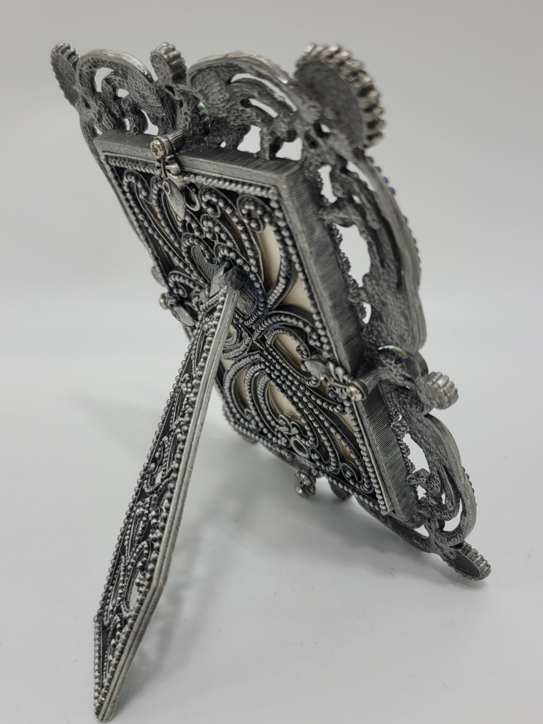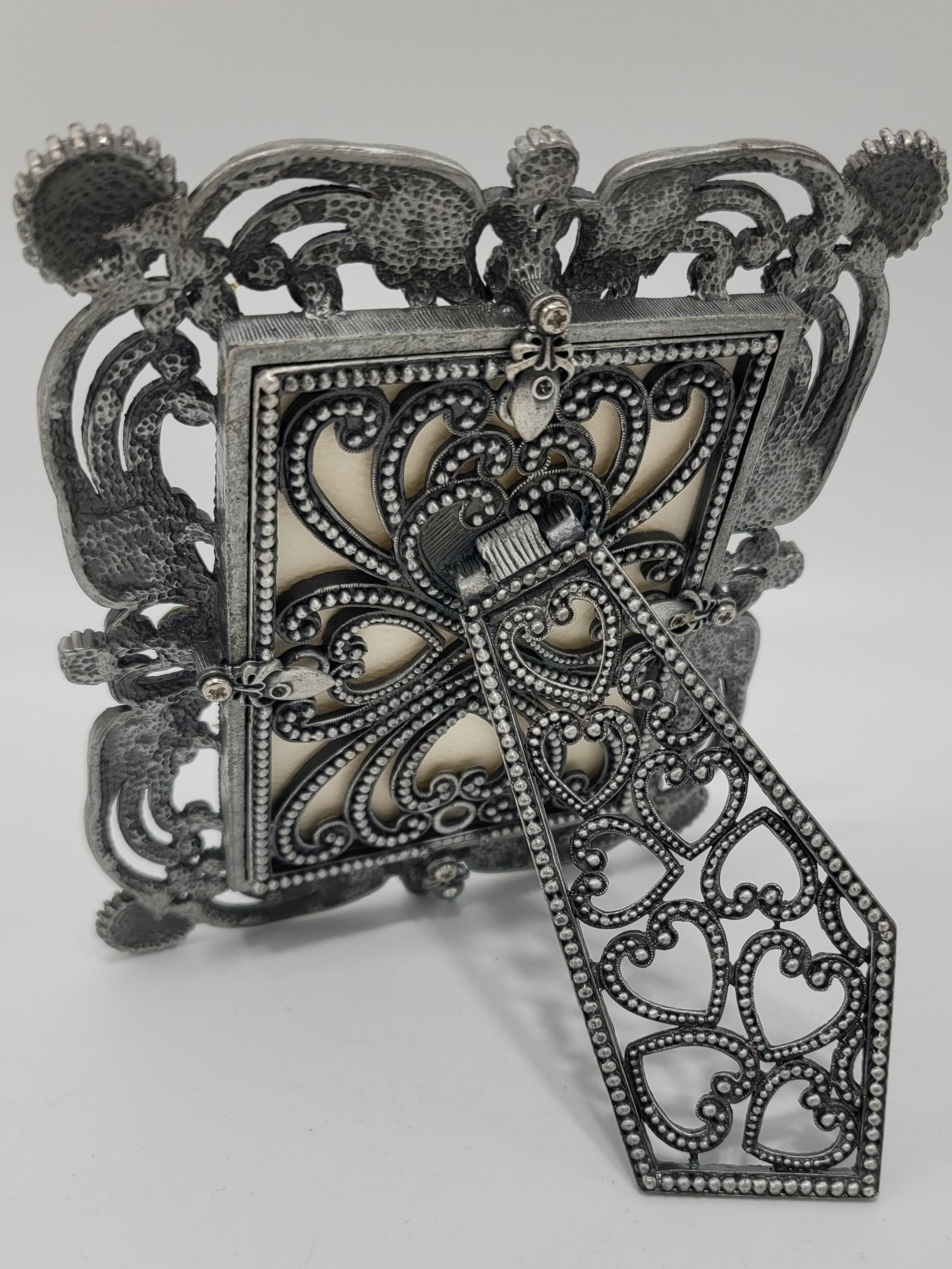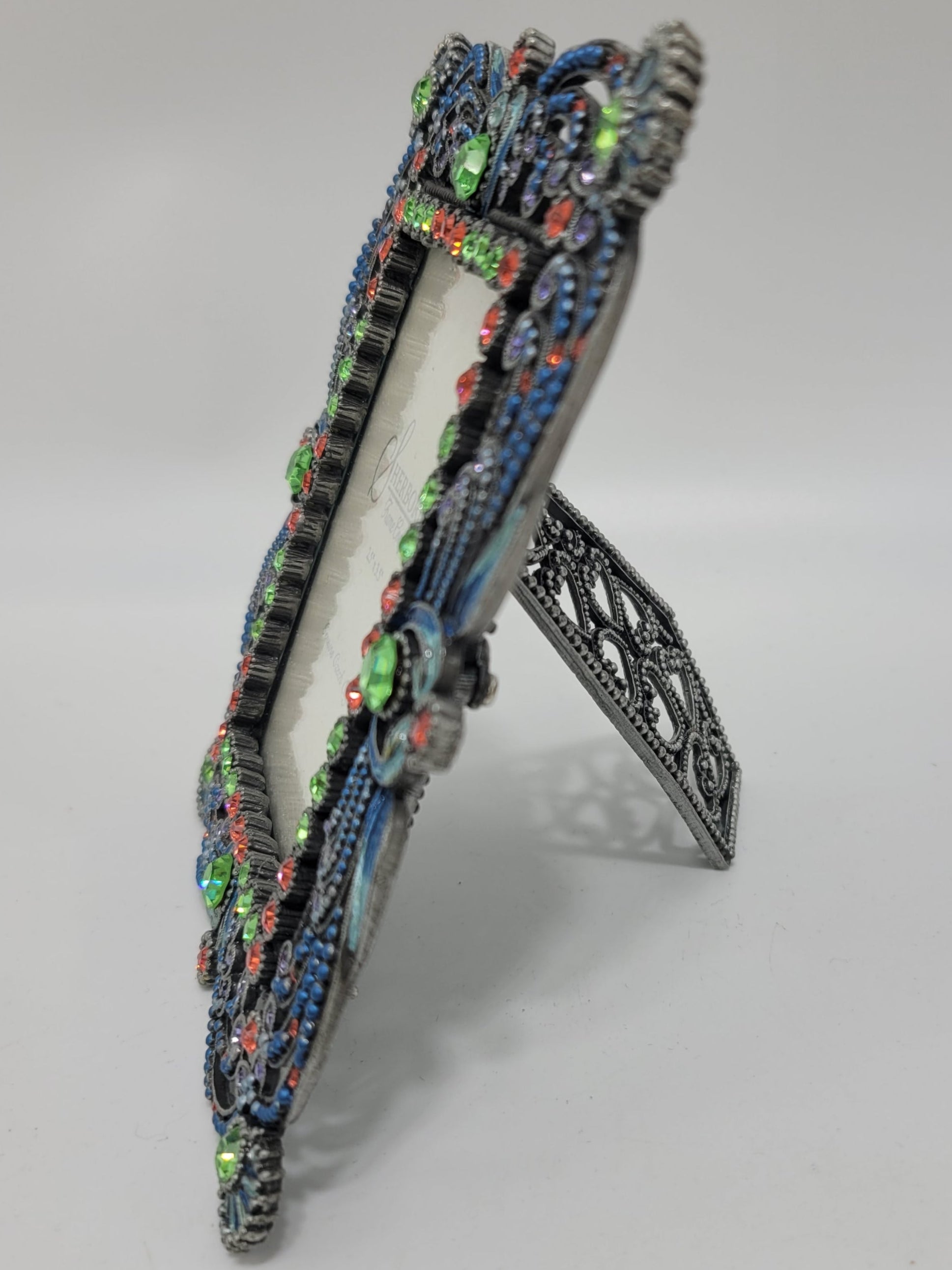 This gorgeous frame sparkles in person. It is covered in Authentic Czech Crystals. The opening for a photo is 2.5 inches x 3.5 inches. The outside measurements are 4.5 inches x 5.5 inches.