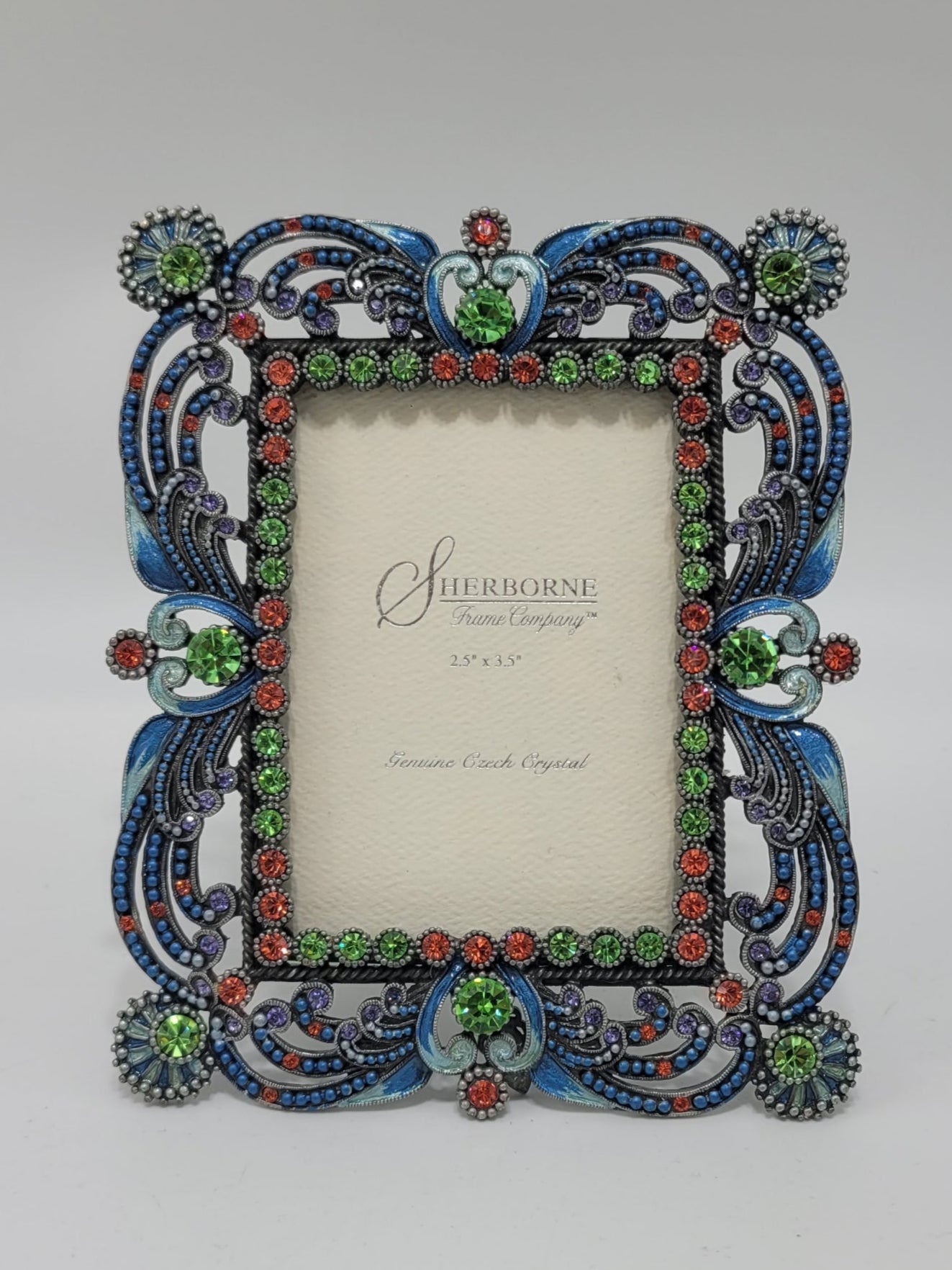 The inside card states SHERBORNE Frame Company, 2.5" x 3.5", Genuine Czech Crystals. The frame is quite heavy and substantial.